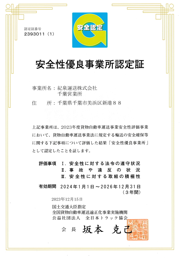 安全への取り組み・Gマーク(千葉営業所) 安全・環境への取り組み 2025.12.24 当社は、国土交通省が推進する「安全性優良事業所(Gマーク)」の認定を受け、事故防止対策、乗務員教育、法令遵守体制の強化に継続して取り組んでいます。