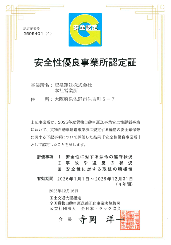 安全への取り組み・Gマーク(本社営業所) 安全・環境への取り組み 2025.12.24 当社は、国土交通省が推進する「安全性優良事業所(Gマーク)」の認定を受け、事故防止対策、乗務員教育、法令遵守体制の強化に継続して取り組んでいます。