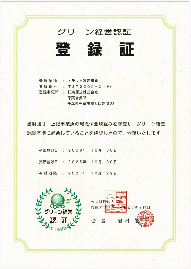 環境への取り組み・グリーン経営(千葉営業所) 安全・環境への取り組み 2025.12.24 当社は、環境保全と経営の両立を目指し、「グリーン経営認証」を取得しています。燃費改善、CO₂削減、適正な車両管理を通じて、環境に配慮した輸送を行っています。
